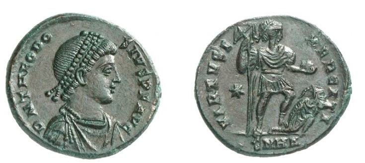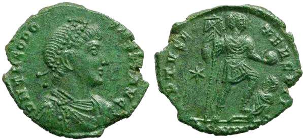 | Heraclea RIC IX 24b Star | Theodosius I AE2. DN THEODO-SIVS PF AVG, pearl-diademed, draped and cuirassed bust right / VIRTVS E-XERCITI, Emperor walking right, treading on captive and holding labarum and globe, star in left field. Mintmark dot SMHB. Cohen 54. | Text | Image |