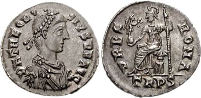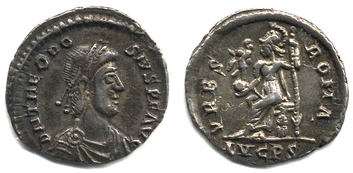 | Lyons RIC IX 43d | Theodosius I AR Siliqua. DN THEODOSIVS PF AVG, pearl-diademed, draped and cuirassed bust right / VRBS ROMA, Roma seated left on cuirass, holding Victory and spear. Mintmark LVGPS. RSC 72b. | Text | Image |