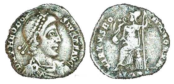 | Lyons RIC IX 43b type 3 | Theodosius I, 379-395 A.D. AR Siliqua. Lyons mint. DN THEODOSIVS PF AVG. Diademed, draped, and cuirassed bust right / VRBS ROMA, Roma seated left, holding sceptre in left hand and Victory on globe in right hand. Mintmark LVGN. | Text | Image |