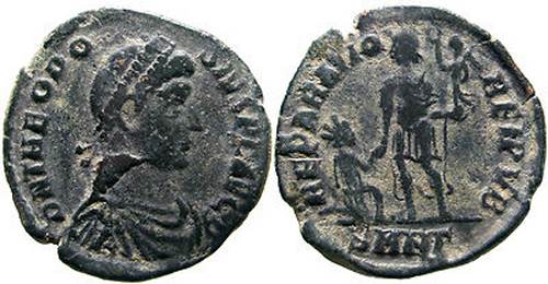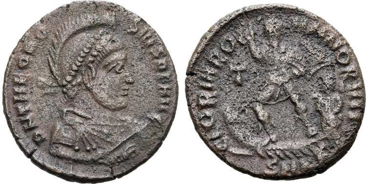 | Heraclea RIC IX 24b | Theodosius I AE2. DN THEODO-SIVS PF AVG, pearl-diademed, draped and cuirassed bust right / VIRTVS E-XERCITI, Emperor walking right, treading on captive and holding labarum and globe. Mintmark dot SMHA. Cohen 54. | Text | Image |