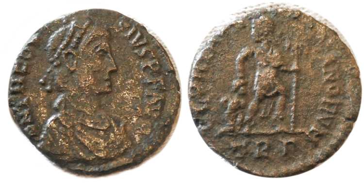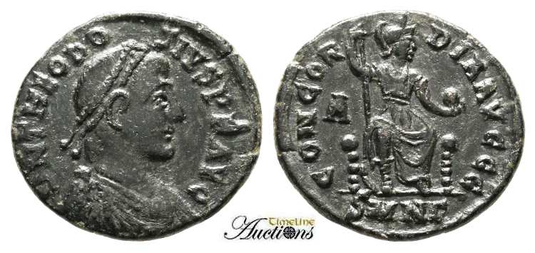 | Antioch RIC IX 47d, Δ | Theodosius I AE3 of Antioch. 378-383 AD. DN THEODOSIVS PF AVG, rosette-diademed, draped and cuirassed bust right. / CONCORDIA AVGGG, Constantinopolis, helmeted, seated facing, head right, on throne, holding partly seen spear and globe; right leg bare; left foot on prow. Θ-Φ over K across fields. Mintmark ANTΔ. RIC IX 47d. | Text | Image |