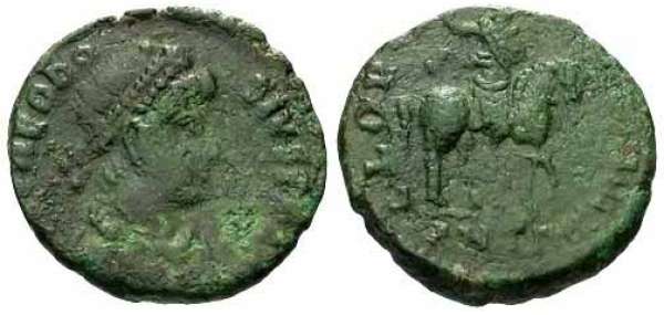 | Antioch RIC 69b | Theodosius I AE3. DN THEODOSIVS PF AVG, pearl-diademed bust right / GLORIA ROMANORVM, emperor on horseback right, hand raised. Mintmark ANTA. | Text | Image |