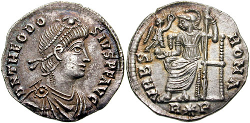 | Rome RIC IX 35c1 | Theodosius I, AR siliqua of Rome. AD 378-383. DN THEODO-SIVS PF AVG, pearl-diademed, draped and cuirassed bust right / VRBS ROMA, Roma, seated left on throne, Victory on globe and inverted spear. Mintmark R star P. RIC IX Rome 35c; RSC 71a; Sear 20453. | Text | Image |