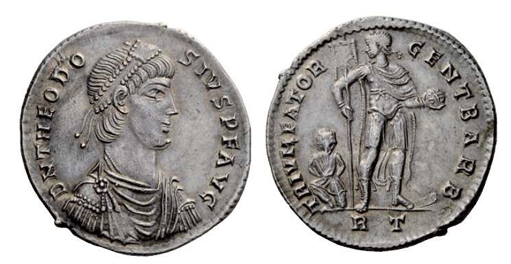 | Rome RIC IX 52a | Theodosius I, AR triple light miliarenses medallion. AD 379–395. 12.92 g. Rome mint. DN THEODOSIVS PF AVG, pearl-diademed, draped and cuirassed bust right / TRIVMFATOR GENT BARB, Theodosius, in military dress, standing slightly right, looking left, holding globe and labarum, captive kneeling on one knee to left. Mintmark RT. RIC IX Rome 52a; RSC 34; Sear 20437; Gnecchi 7. | Text | Image |