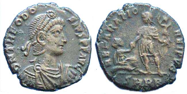 | Rome RIC IX 63b | Theodosius I AE3. 388-394 A.D. DN THEODOSIVS PF AVG, pearl-diademed, draped and cuirassed bust right / SPES REIPVBLICAE, emperor, helmeted and in military dress, standing facing, head left, holding labarum and globe, right foot on captive. Mintmark RB. | Text | Image |