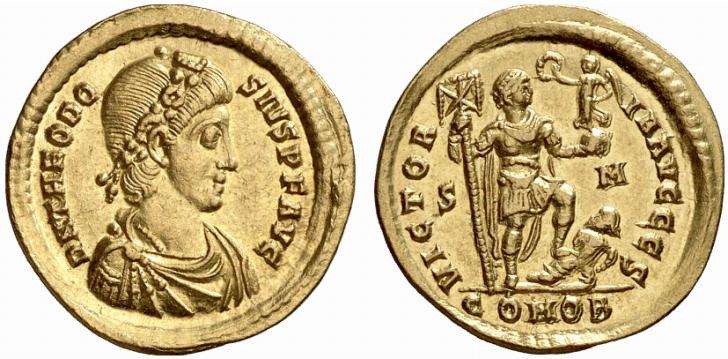 | Milan RIC 5f | Theodosius I AV Solidus. Diademed, draped and cuirassed bust right / Two nimbate emperors enthroned, holding globe between them; M-D across fields. Mintmark COM. | Text | Image |