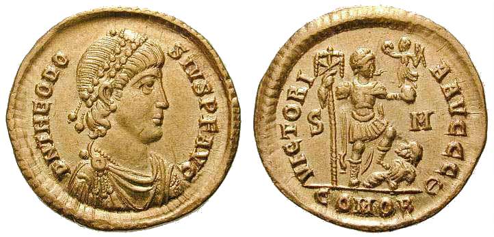 | Sirmium RIC IX 15, Θ | Theodosius, AV Solidus. Sirmium mint. Struck AD 393-395. DN THEODOSIVS PF AVG, pearl-diademed, draped and cuirassed bust right / VICTORI-A AVGGGΘ, emperor standing right, holding labarum and Victory on globe, spurning captive at foot. S-M across fields. Mintmark COMOB. RIC IX Sirmium 15. | Text | Image |