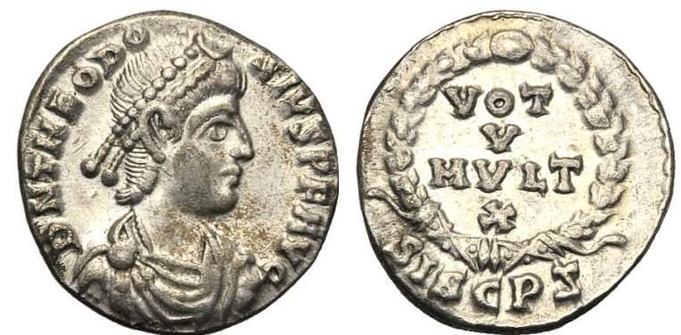 | Siscia RIC IX 24b | Theodosius I, AR siliqua of Siscia. AD 383-388. DN THEODO-SIVS PF AVG, pearl-diademed, draped, cuirassed bust right / VOT V MVLT X in four lines within wreath. Mintmark SISCP runic S. RIC IX Siscia 24b; RSC 64b; Sear 20462. | Text | Image |