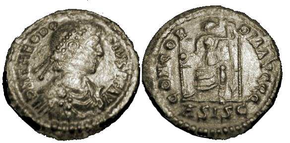 | Siscia RIC IX 26c type 1 | Theodosius I AE2. Siscia. DN THEODO-SIVS PF AVG, pearl-diademed, draped and cuirassed bust right. / REPARATIO REIPVB, Theodosius standing front, head left, holding Victory on globe and raising kneeling woman. Mintmark ASISC. RIC IX 26c type 1. | Text | Image |
