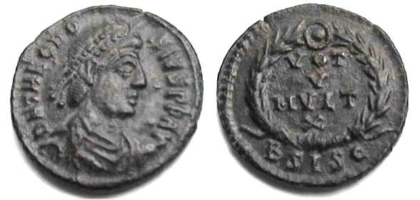 | Siscia RIC IX 29d | Theodosius I AE4. 379-383 AD. DN THEODO-SIVS PF AVG, pearl-diademed, draped and cuirassed bust right / VOT V MVLT X within wreath. Mintmark ASISC. | Text | Image |