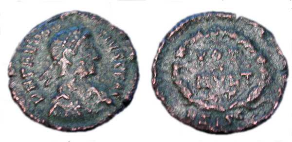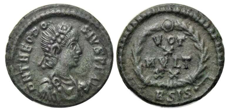 | Siscia RIC IX 30b | Theodosius I AE4. 379-383 AD. DN THEODO-SIVS PF AVG, pearl-diademed, draped and cuirassed bust right / VOT X MVLT XX within wreath. Mintmark ASISC. | Text | Image |