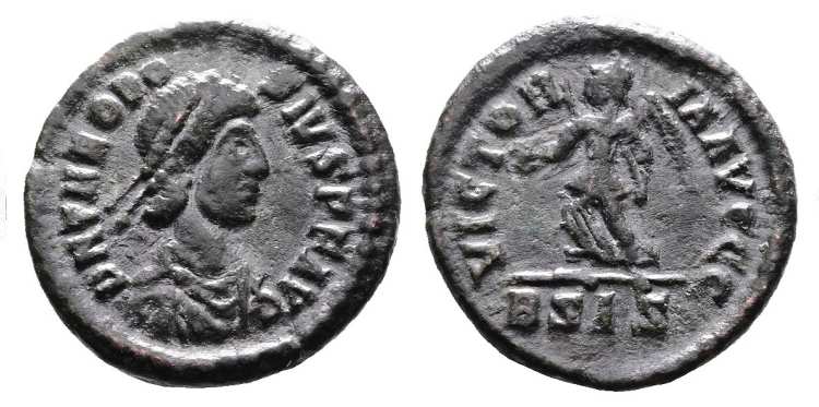 | Siscia RIC IX 37b | Theodosius I AE4, Siscia. DN THEODO-SIVS PF AVG, pearl-diademed, draped and cuirassed bust right / VOT X MVLT XX within wreath. Mintmark BSIS dot. RIC IX Siscia 37b. | Text | Image |