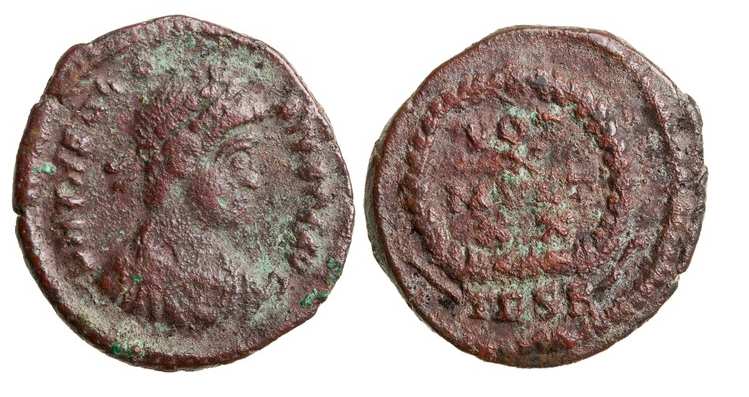 | Cyzicus RIC IX 20c | Theodosius I AE4, Cyzicus. DN THEODOSIVS PF AVG, pearl-diademed, draped and cuirassed bust right / VOT V within wreath. Mintmark SMKΔ. | Text | Image |