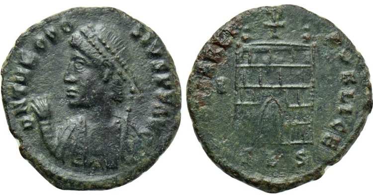 | Thessalonica RIC IX 59b,A | Theodosius I, Thessalonica, AE3, 17mm. DN THEODOSIVS PF AVG, pearl-diademed bust left, wearing imperial mantle, holding mappa in raised right hand and sceptre / GLORIA REIPVBLICE, campgate, five layers, two beacons, no door. P-headed cross above, officina letter A (unlisted for Theodosius) in left field. Mintmark TES. Ref: RIC IX Thessalonica 59b var. | Text | Image |