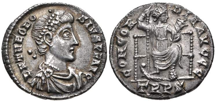 | Trier RIC IX 94b | Theodosius I AR Siliqua. DN THEODOSIVS PF AVG, pearl-diademed, draped, and cuirassed bust right / VIRTVS ROMANORVM, Roma seated left on cuirass, holding Victory and reversed spear; mintmark TRPS. RIC IX Trier 94b/106a; RSC 57a. | Text | Image |