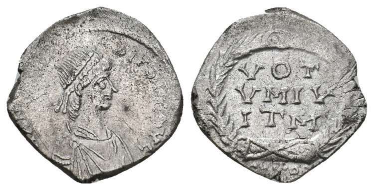 | Trier RIC 59b var | Theodosius I, AR heavy miliarense, 25 mm, 5.23 gr. Trier. DN THEODO-SIVS PF AVG, pearl-diademed, draped and cuirassed bust right / VOTIS V MVLTIS X in four lines within wreath. Mintmark TRPS. Lanz 100, lot 632; RIC IX Trier 59b var (Siliqua and rev legend); Holway hoard 315 var (Siliqua, VOT V MVLTIS X); RSC -. Unpublished. | Text | Image |