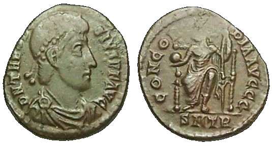 | Trier RIC IX 68c | Theodosius I, AE3 of Trier, 379-383 AD. DN THEODO-SIVS PF AVG, pearl-diademed, draped and cuirassed bust right / CONCOR-DIA AVGGG, Roma, helmeted, seated facing on throne, head left, holding globe and spear (spear wholly visible). Mintmark SMTR. RIC IX Trier 68c. | Text | Image |