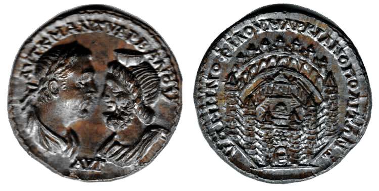 | Markianopolis Varbanov 1972 type | Ivan Varbanov, AE27 (copper), based on an issue of Markianopolis, Moesia. AVT K M ANT VAΡBANOV AVΓ, laureate, draped bust of Ivan Varbanov right, facing draped bust of Serapis left, polos on head. / VΠ MHNOΦIΛOY MAΡKIANOΠOΛITΩN, legend ending in a small kantharos-like monogram, city view of Markianopolis, surrounded by wall with thirteen towers, temple and altar within the courtyard. Based on Moushmov 805; Varbanov 1972 of Gordian III. | Text | Image |