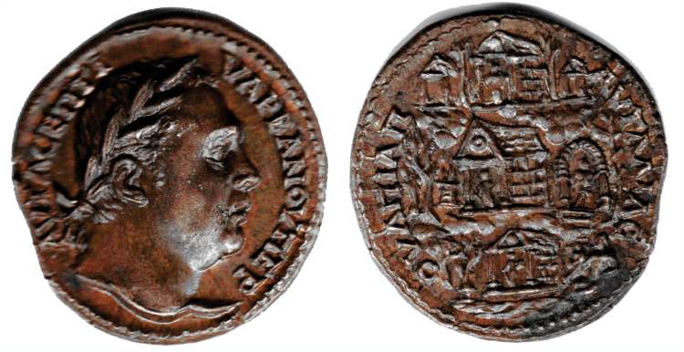 | Pautalia Varbanov 4833 type | Ivan Varbanov, AE29 (copper), based on an issue of Pautalia, Thrace. AVT Λ CEΠTI VAΡBANOV ΠEΡ, laureate head of Ivan Varbanov right. / OYΛΠIAC ΠAYTAΛIAC (first AC ligate), View of the Pautalian mountain-temple complex, from top to bottom: central temple with deity standing left within and a tree and small shrine to left and right, another temple with deity standing within and an altar and tree to left and a cave entrance with a figure within and trees to right, another temple with a deity standing within and trees to left. River-god reclining left at the base of the mountain, holding cornucopiae. Based on Varbanov 4833 of Septimius Severus. | Text | Image |