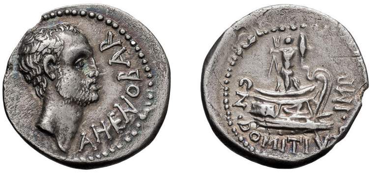 | Domitia 21 | Cn. Domitius Ahenobarbus AR Denarius, 41 BC. Mint moving with Ahenobarbus. 3.57 g. AHENOBAR, bearded head of L. Ahenobarbus right / CN DOMITIVS IMP, prow right, surmounted by a trophy with two spears and shields. Domitia 21; Crawford 519/2; Sydenham 1177; Sear Imp. 339. | Text | Image |