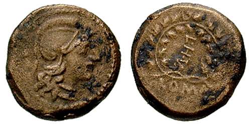 L H Tub AE Uncia. 105 BC. Helmeted head of Roma right / L dot H dot TVB downwards in oak-wreath; ROMA below. Cr315/1.