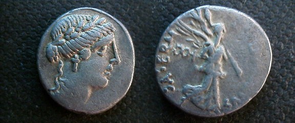 L. Hostilius Saserna denarius c. 48 BC. Head of Gallia right, hair long and dishevelled, Gallic trumpet behind. / L HOSTILIVS SASERNA, cult image of Diana of Ephesus facing with stag and spear. Syd. 953; Cr448/3.