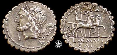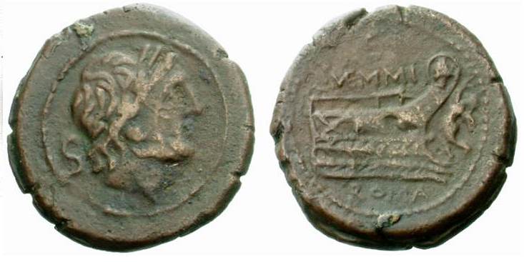 | Memmia 4 | L Memmius L.f. Galeria, AE Semis, 94 BC. Laureate head of Jupiter right, S behind head / L MEMMI abover prow right, S in right field. ROMA in exergue. Memmia 4; Syd 575a; Cr313/3; Sear 897. | Text | Image |