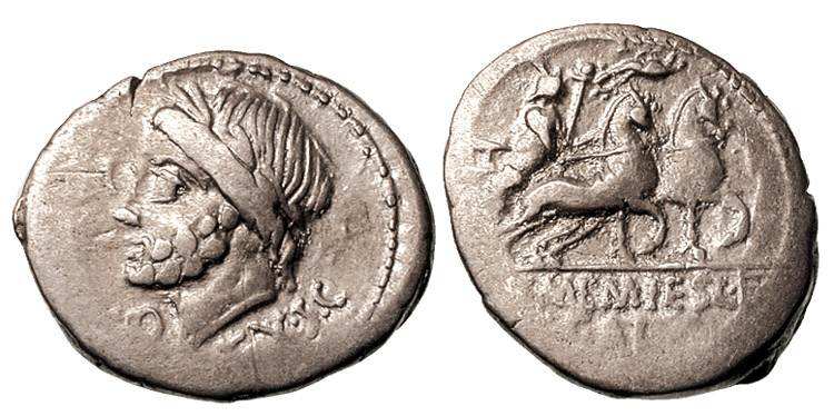 | Memmia 2a | L. Memmius Galeria. 106 BC. AR Serrate Denarius. Laureate head of Saturn left, harpa behind / Venus in biga right, Cupid flying above with laurel wreath. Cr313/1c, Syd 574a.