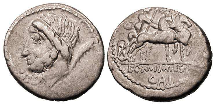 | Memmia 8b | L & C Memmius Lf Galeria Denarius. ca 87 BC. Head of Saturn left, harpa behind, control CIV (retrograde) under chin, EX S C under neck / Venus in biga right, above Cupid flying left with wreath, L C MIMIES L F / GAL in ex. Cr349/1, Syd 712.