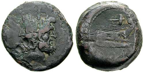 | Syd 616 | C [Poblicius] Malleolus AE As. ca 96 BC. Laureate head of Janus / Prow right; hammer above. Cr335/4, Syd 616.