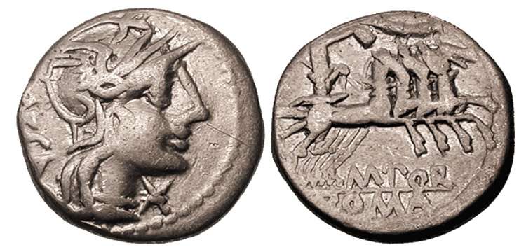 Porcia 8 Sear5 158 | L Porcius Liciniuss AR denarius. c.112-109 B.C. L PORCI LICI star, head of Roma right / L LIC CN DOM, Warrior (Bitiutusi) in biga hurling spear. Syd 520.