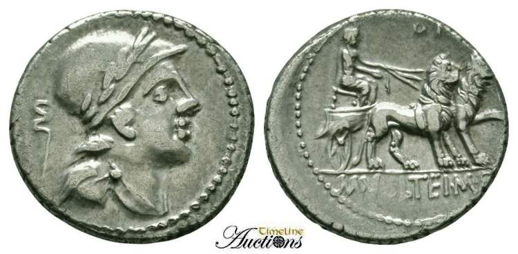Volteia 4 symbol 58 | Republican AR denarius, M. Volteius M. f. 78 BC, 18.81mm, 3.64 g. Laureate and helmeted bust of Attis right; symbol of a double-hooked staff behind head (Cr. symbol 58) behind head / Cybele seated right in chariot drawn by two lions; O Γ above, M VOLTEI M F in exergue. Volteia 4; Crawford 385/4 ; Sydenham 777; Sear 315. | Text | Image |