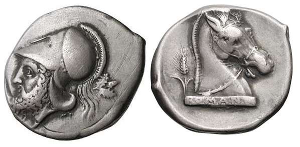 Anonymous AR Didrachm. Perhaps struck at Metapontum, 280-276 BC. Helmeted head of Mars left, oak-sprig behind / ROMANO on tablet below head of bridled horse right, ear of wheat behind. Cr13/1, Syd 1.