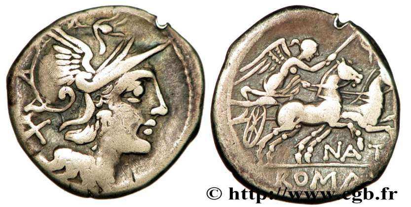 Pinarius Natta Denarius. 155 BC. Roma right, X behind / Victory in biga, NAT below, ROMA in ex. Pinaria 2, Cr200/1, Syd 382.