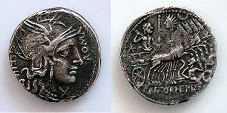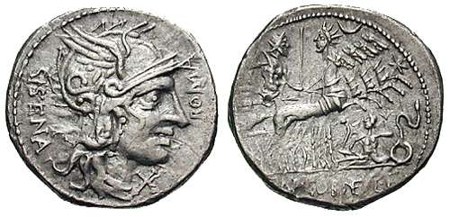 Cn. Cornelius Sisenna. 118-107 B.C. AR Denarius. Helmeted head of Roma r.; behind, SISENA; before, ROMA; X below chin / Jupiter in quadriga r. hurling thunderbolt; below, anguipede giant with thunderbolt; CN CORNEL L F in ex. Syd 542,. Cr310/1.