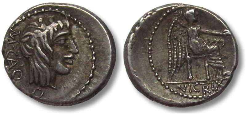 M Porcius Cato AR Quinarius. 89 BC. Head of Liber right, crowned with an ivy wreath, M•CATO behind, number below / Victory seated right, holding palm & patera, VICTRIX in ex. Syd 597b, Cr343/2b.