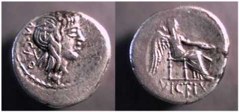 M Porcius Cato AR quinarius. 89 BC. Head of Liber right, crowned with an ivy wreath, M•CATO behind, differing symbols below / Victory seated right, holding palm and patera. VICTRIX in ex. Syd 597c, Cr343/2b.