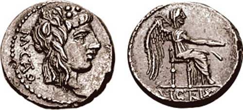 M Porcius Cato AR Quinarius. 89 BC. Head of Liber right, crowned with an ivy wreath, M•CATO behind, Latin letter below / Victory seated right, holding palm & patera, VICTRIX in ex. Syd 597b, Cr343/2b.