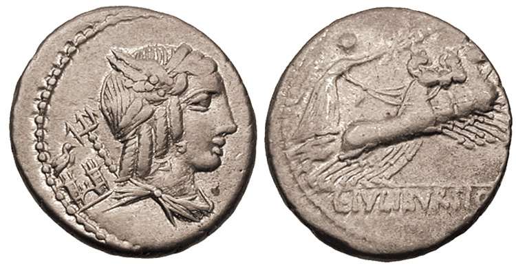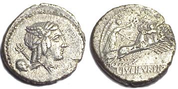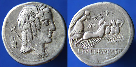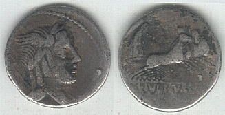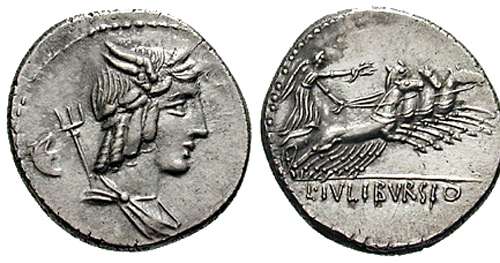 L Julius Bursio Denarius. 85 BC. Winged head of Genius or Apollo Vejovis right, control-mark & trident behind / Victory in quadriga right holding wreath, L IVLI BVRSIO in ex. Syd 728, Cr352/1a.