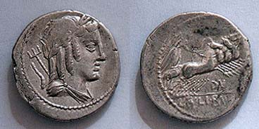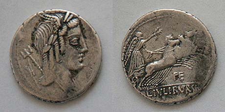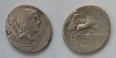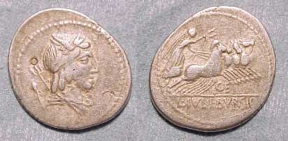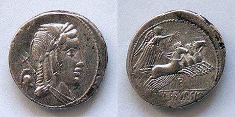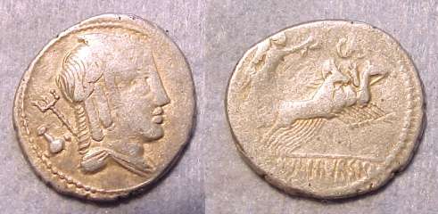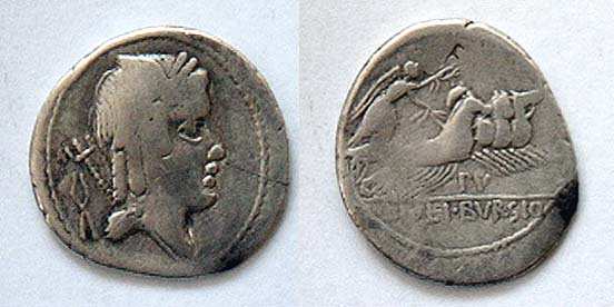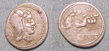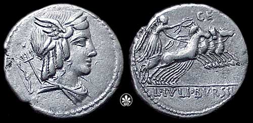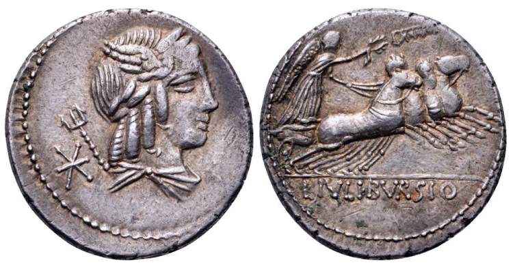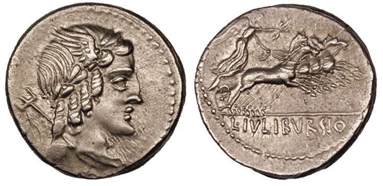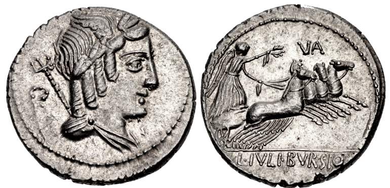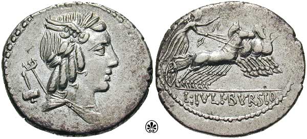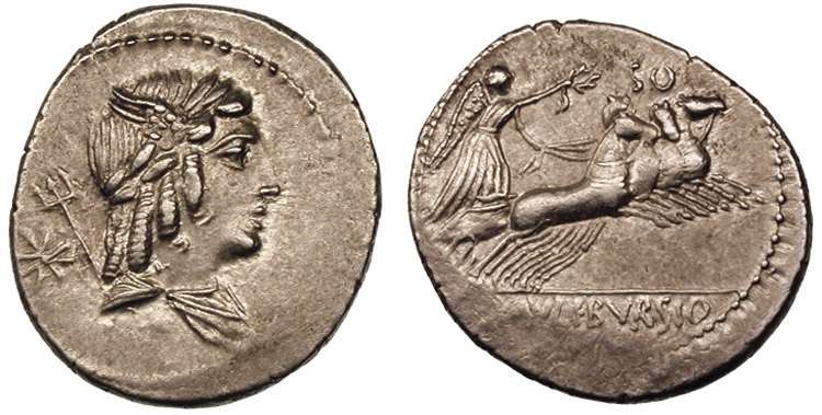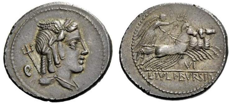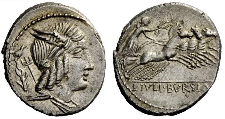 L Julius Bursio AR Denarius. 85 BC. Bust of Apollo Vejovis or Genius right, trident & control mark behind / Victory in quadriga right; number above. Cr352/1c, Syd 728a-b.