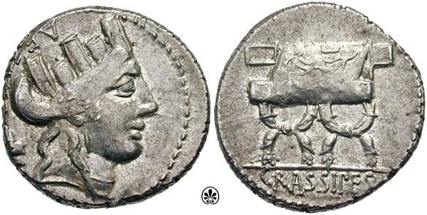 P Furius Crassipes Denarius. 84 BC. AED CVR, Turreted head of City right, foot turned up behind / P FOVRIVS on curile chair, CRASSIPES in exergue. Syd 735; Cr356/1a.