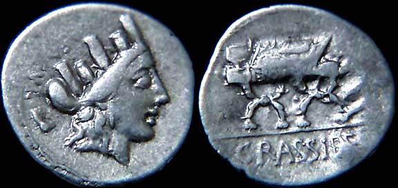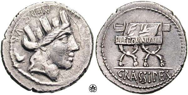 P Furius Crassipes Denarius. 83 BC. AED CVR, turretted head of city goddess right / Curile chair inscribed P FOVRIUS, CRASSIPES in ex. Syd 735b, Cr356/1c.