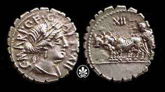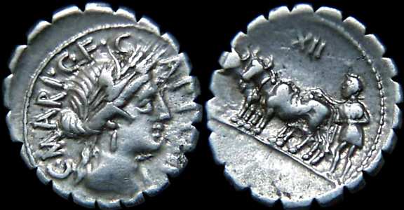 C. Marius C.f.Capito, 81 BC. AR Serrate Denarius. C MARI C F CAPIT, draped bust of Ceres right / farmer ploughing with yoke of oxen, SC in ex. Cr378/1b, Syd 744a.