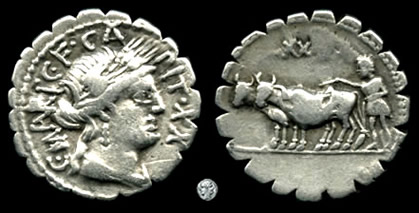 C. Marius C.f. Capito. 81 BC. Serrate Denarius. C. MARI. C. F. CAPIT. XII, draped laureate bust of Ceres right / Husbandman plowing with yoke of oxen; XII above. Crawford 378/1; Syd 744.