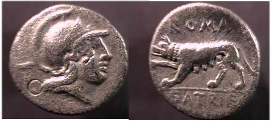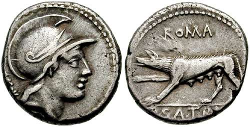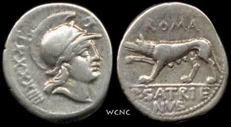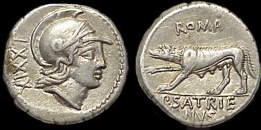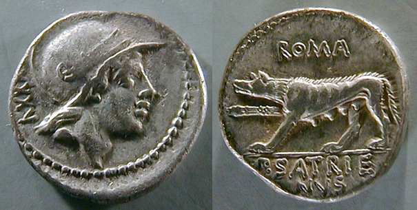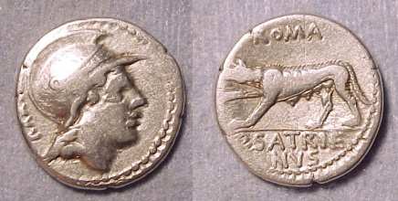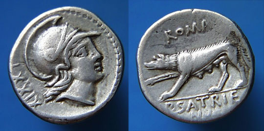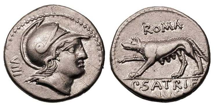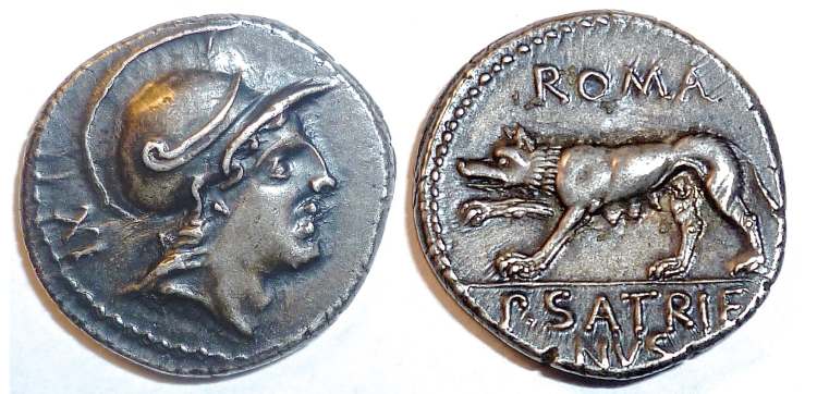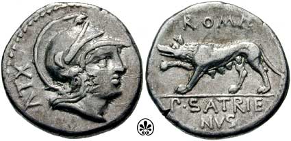 P Satrienus Denarius. 77 BC. Helmeted head of young Mars right, border of dots; Control numeral XXXV behind / She wolf prowling left, ROMA above, P SATRIE NVS in ex.