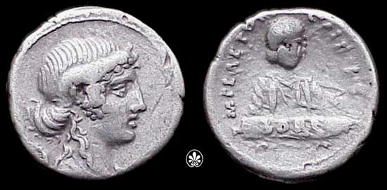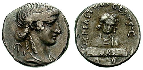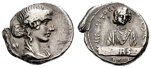 M. Plaetorius M.f. Cestianus. 57 BC. AR Denarius. Draped bust of Fortuna right, tongs (?) behind / Half-length bust of Sors facing, head slightly right; tablet inscribed SORS below. Crawford 405/2; Syd 801.