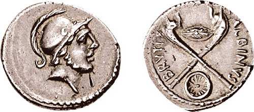 D Junius Brutus Albinus Denarius. 48 BC. Head of young Mars right, wearing a crested helmet / BRVTI F ALBINVS, two gallic trumpets in saltire, oval shield above, round shield below. Cr450/1a; Syd 941.