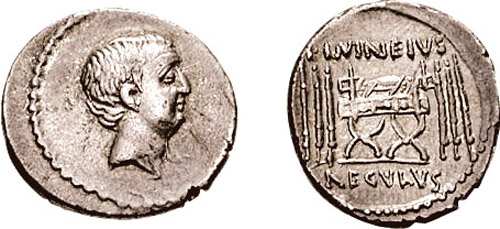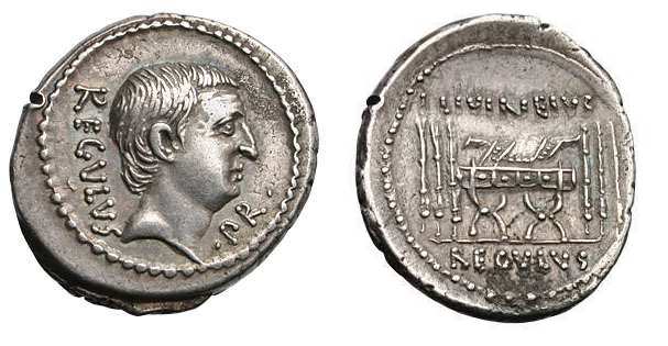 L. Livineius Regulus. 42 BC. Denarius. REGVLVS PRM, bare head of the praetor L. Livineius Regulus right / LIVINNVS/REGVLVS, curule chair between six fasces. Crawford 494/27; Syd 1109.