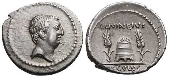 L. Livineius Regulus. 42 BC. AR Denarius. Head of L. Livineius Regulus right / Modius between two grain ears, REGVLVS below. Cr494/29, Sydenham 1111.