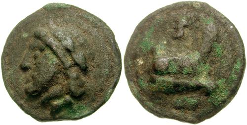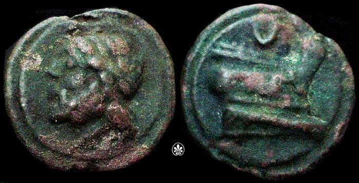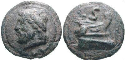 Æ Aes Grave Semis of the Republic. 225-217BC. Laureate head of Saturn left, S horizontally below; all on raised disk / Prow of galley right, S above; all on raised disk. Crawford 35/2.